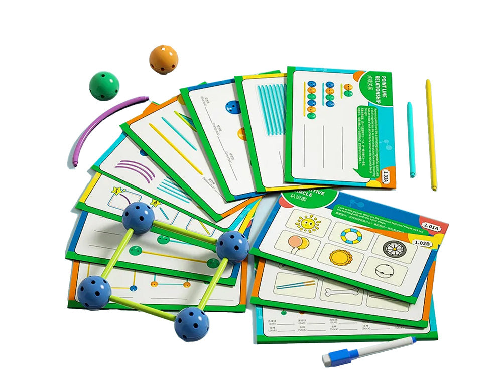 Princip hry je jednoduchý – barevné kuličky slouží jako spojovací body, do kterých se zasunují tyčky různých délek. Děti tak mohou stavět geometrické tvary, budovy, mosty nebo vlastní fantazijní konstrukce. V sadě najdete také kartičky s úkoly, které nabízejí inspiraci a postupně zvyšují obtížnost staveb.
