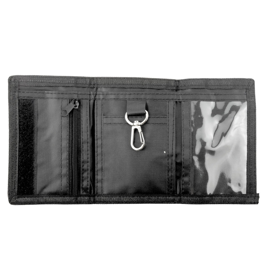 Peněženka je vyrobena z kombinace textilního materiálu, plastu a kovových prvků. Uvnitř najdete průhlednou kapsu na fotografii nebo doklad, zipovou kapsu na mince, větší kapsu na bankovky a kovový háček perfektní pro připevnění klíče nebo přívěsku. Zapínání na suchý zip je jednoduché a spolehlivé.