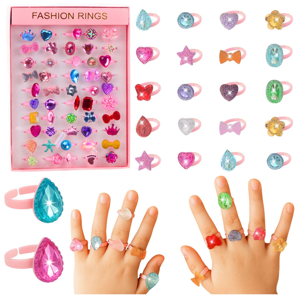 Prstýnky jsou vyrobeny z lehkého plastu s nastavitelným průměrem, který se přizpůsobí dětským prstům. Motivy zahrnují srdíčka, hvězdičky, korunky, mašličky, krystaly a květiny v pestré barevné kombinaci. Produkt je určen pro hru, převlékání a jako módní doplněk.