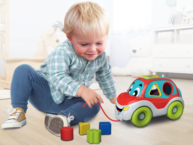 Autíčko kombinuje funkci tahací hračky s edukativním tříděním tvarů. Obsahuje barevné kostky různých tvarů, které děti vkládají do odpovídajících otvorů. Hračka podporuje rozvoj jemné motoriky, koordinace ruky a oka, rozpoznávání tvarů a barev i základy jazyka. Kufr na zadní straně autíčka se snadno otevírá pro vyjmutí kostek.