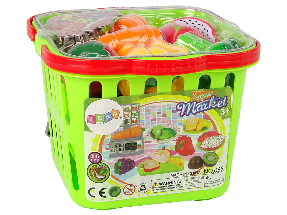 Sada obsahuje zelený košík plný barevného ovoce a zeleniny, misku, talířky, nůž, krájecí prkénko a obchodní váhu. Děti si mohou potraviny rozložit na dřevěném prkénku, rozřezat je speciálním nožem, zvážit na váze a servírovat na talířcích nebo smíchat v misce. Košík s praktickými červenými uchy slouží jako perfektní úložný prostor pro všechny součásti.