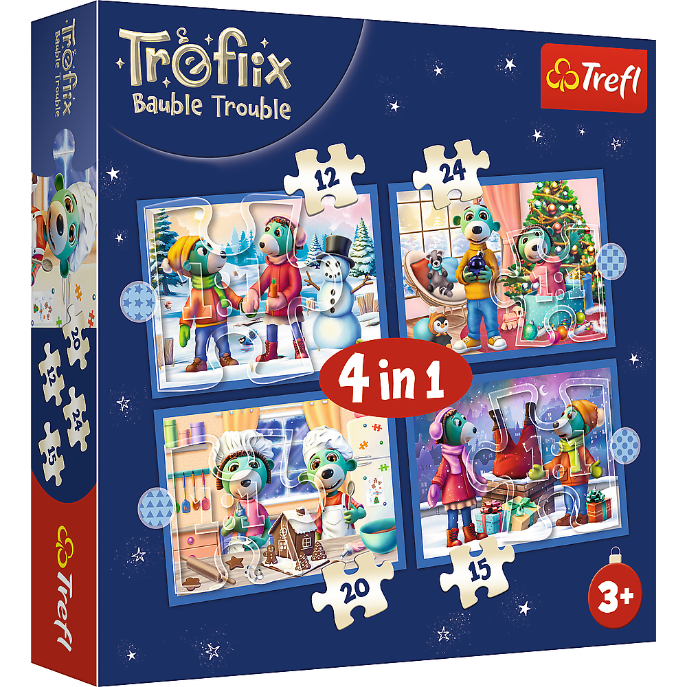 Puzzle 4v1 Sněží u Treflíků je sada čtyř samostatných puzzle s zimní tématikou, která potěší malé fanoušky pohádky Rodina Treflíků. Po složení vzniknou čtyři obrázky s oblíbenými postavičkami, přičemž největší puzzle měří 285 × 205 mm. Díky různému počtu dílků si skládání užijí jak mladší, tak o něco starší děti.
