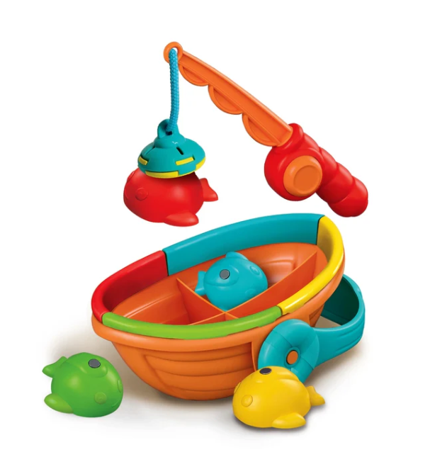 Rybářský prut s magnetickou šňůrou je snadný a okamžitý na použití. Lodička slouží zároveň jako plovoucí hračka, se kterou si děti mohou hrát během koupání. Sada obsahuje 4 rybičky, které je třeba přiřadit ke správnému barevnému oddílu v lodičce. Materiál: recyklovaný plast.