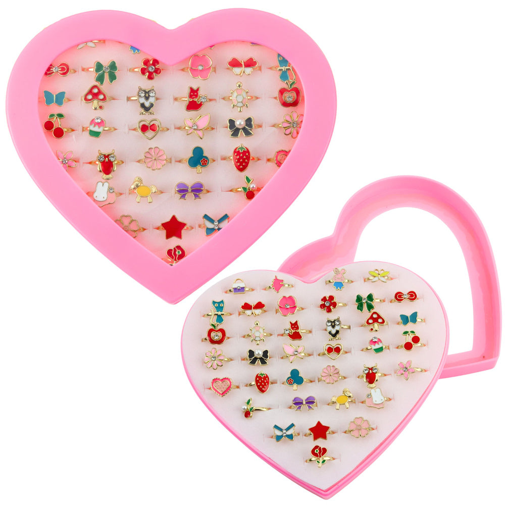 Sada obsahuje 36 různých prstenů s motivy květin, zvířátek, srdíček a dekorativních tvarů. Všechny prsteny jsou nastavitelné, což umožňuje snadné přizpůsobení velikosti. Dodávají se v originální krabičce ve tvaru srdce, která slouží zároveň jako úložný box.