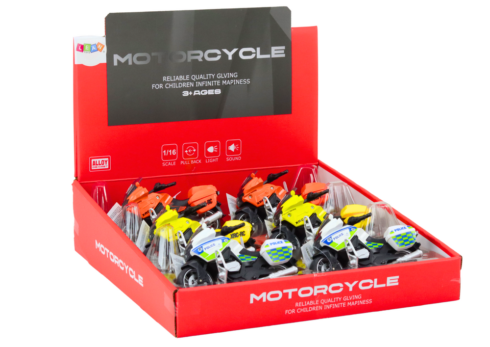 Sportovní motorka s frikčním pohonem přináší dětem realistický zážitek ze světa dvoukolových strojů. Inovativní frikční mechanismus umožňuje motorce plynule a dynamicky se pohybovat – stačí ji lehce posunout dopředu nebo dozadu a pak pustit. Model je dostupný ve třech atraktivních barevných provedeních: žluté, oranžové a bílé, které se dodávají náhodně.