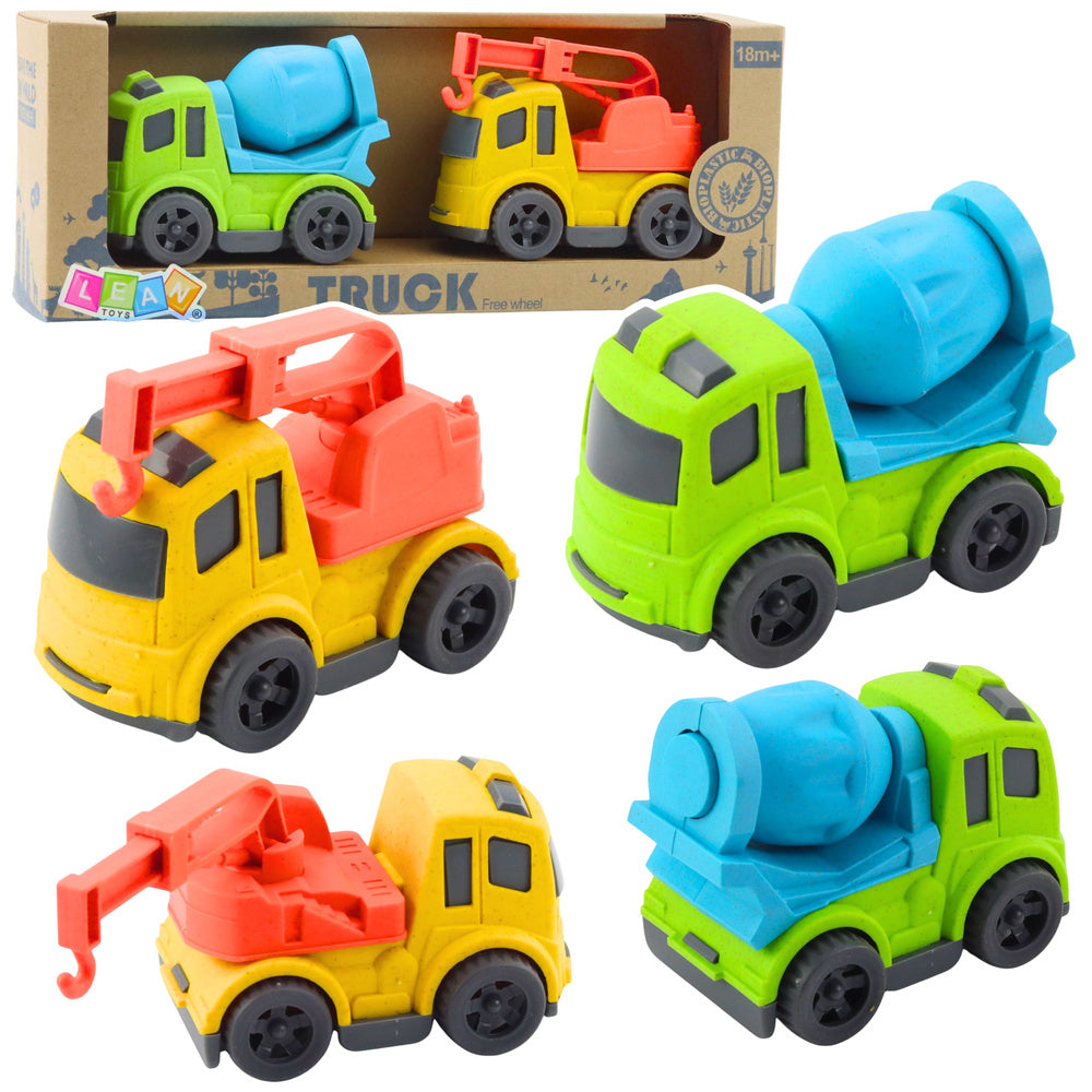 Sada zahrnuje domíchávač s otočným bubnem a odtahové auto s otočným a výsuvným hákem. Pohyblivé prvky obohacují hru a umožňují dětem hrát si na různé stavební scénáře. Manipulace s prvky podporuje rozvoj manuální zručnosti, koordinaci oko-ruka a jemnou motoriku.