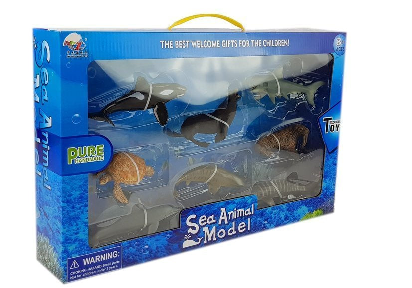 Zestaw złożony jest z 8 elementów, występują w nim: 3 rekiny, mors, foka, delfin, żółw oraz orka. Średnia długość figurek wynosi około 12 cm.