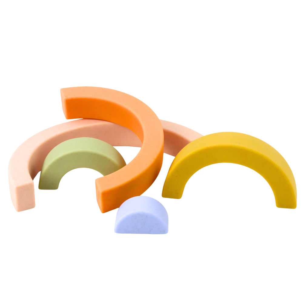 Kostky jsou vyrobeny z kvalitní gumy, která je měkká a pružná. Pastelové duhové barvy přitahují pozornost dětí a podporují vizuální vnímání. Sada obsahuje pět bloků různých velikostí, které lze libovolně skládat. Zaoblené tvary bez ostrých hran zajišťují maximální bezpečnost při hře.