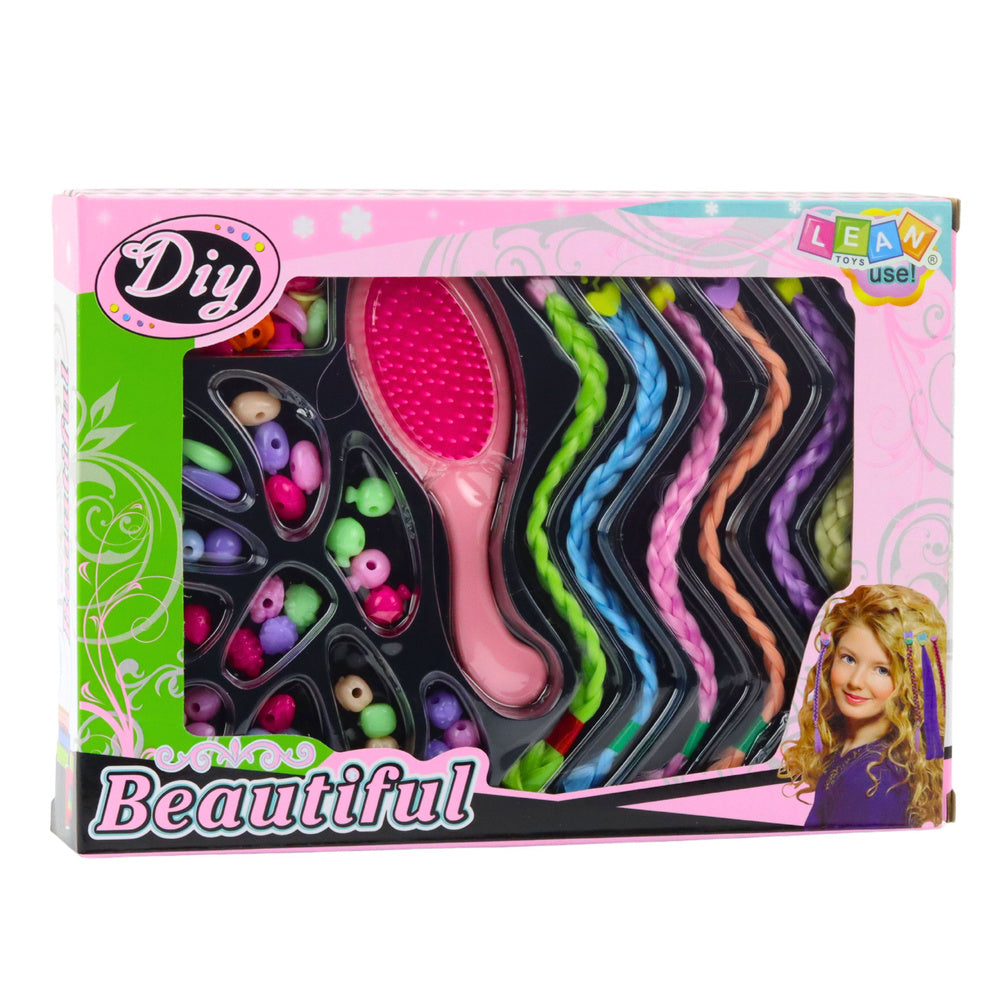 Sada je vyrobena z plastu a syntetických vláken, což zajišťuje bezpečnost při používání. Obsahuje vše potřebné pro vytváření stylových účesů – barevné prameny na pletení, dekorativní korálky a kartáč na vlasy. Produkt je určen pro kreativní a stylovou zábavu.