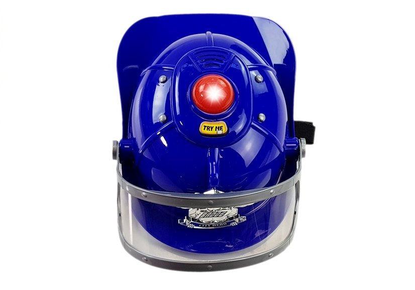 Přilba je vybavena pohyblivým štítkem a elastickým páskem pro pohodlné nošení. Po stisknutí tlačítka "Try me" se rozsvítí světla a ozve se policejní siréna. Baterka slouží k osvětlení prohledávaných míst ve tmě. Všechny prvky jsou vyrobeny z kvalitního plastu v kombinaci tmavě modré a černé barvy, což zajišťuje dlouhou životnost a snadnou údržbu.