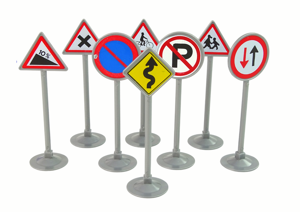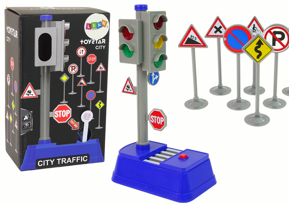 Sada obsahuje šedý semafor s realistickými funkcemi – při zapnutí svítí červená pro vozidla a zelená pro chodce, přesně jako v reálném provozu. Semafor navíc vydává zvuky podobné skutečným světelným signalizacím na křižovatkách. V sadě najdete také osm výstražných a zákazových dopravních značek vysokých 9 cm, které děti seznámí s různými silničními symboly a posílí jejich povědomí o bezpečnosti.