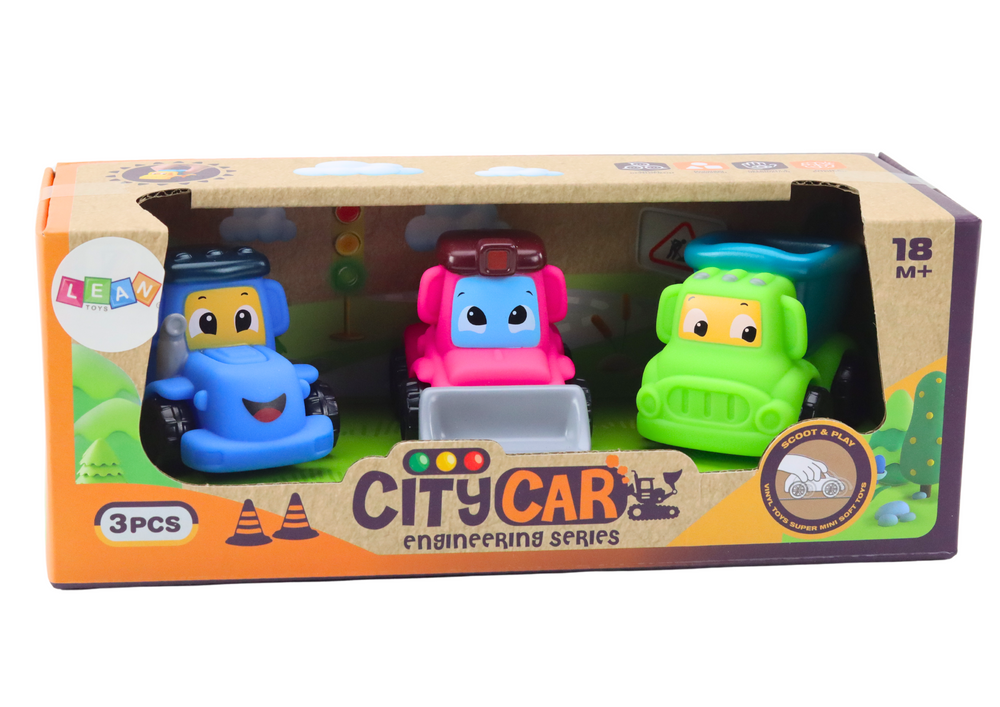 Set obsahuje tři roztomilá vozidla: traktor, buldozer a sklápěč. Auta jezdí na setrvačník, takže je dítě snadno rozhýbe, přičemž rozvíjí motorické dovednosti a koordinaci ruky a oka. Díky kompaktní velikosti si vozidla můžete vzít kamkoliv – na procházku, návštěvu, výlet nebo cestu autem.