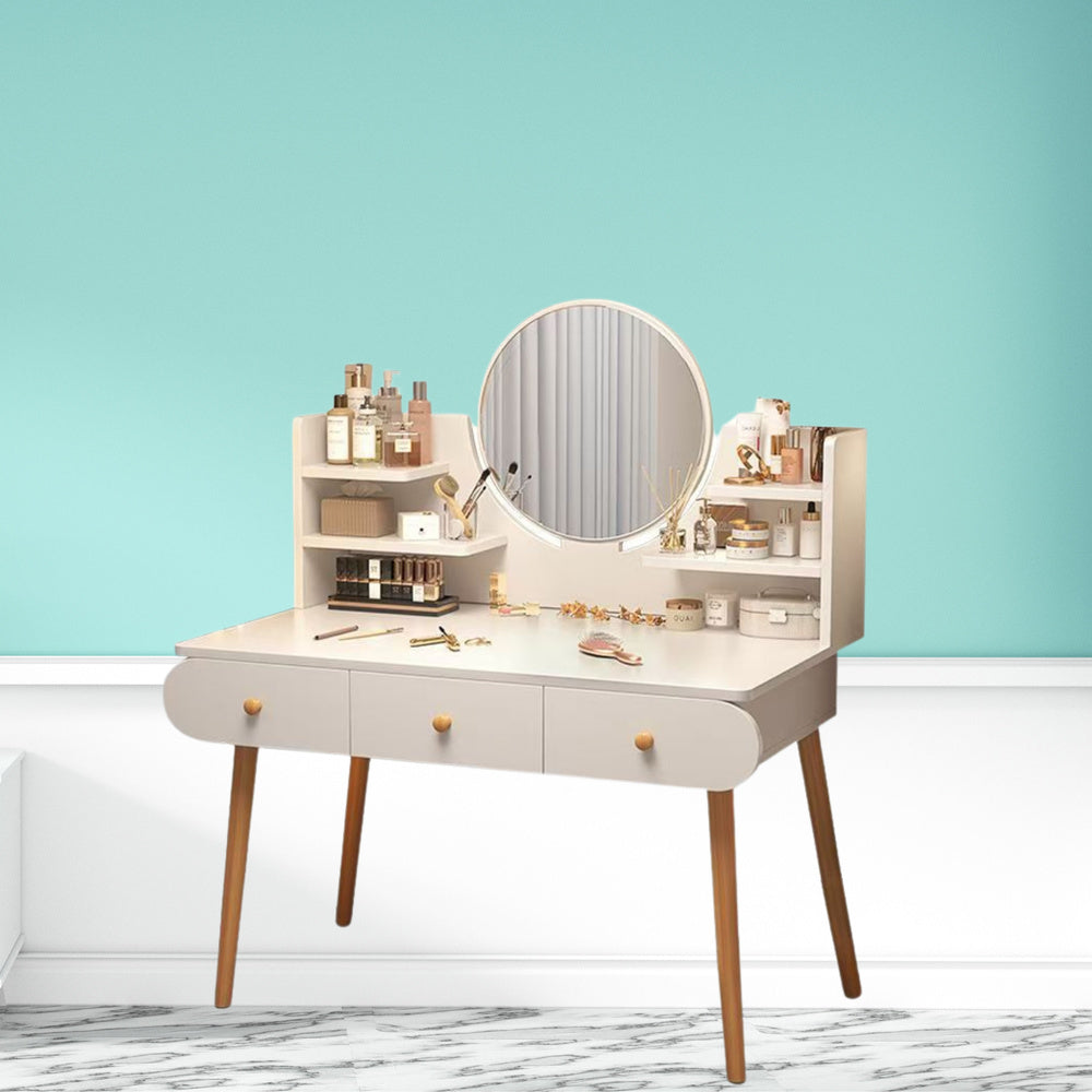Tři hluboké a prostorné zásuvky usnadňují ukládání kosmetiky, šperků a vlasových či manikúrních doplňků – vše potřebné máte po ruce. Otevřený prostor na desce a boční police umožňují praktickou organizaci často používaných produktů a zároveň dodávají toaletnímu stolku dekorativní charakter.