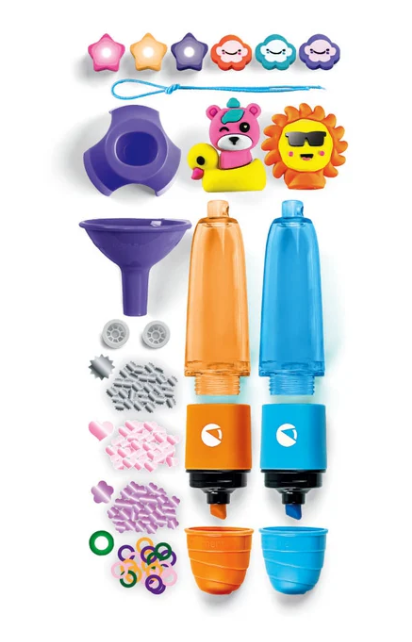 Tato praktická sada obsahuje vše potřebné pro výrobu personalizovaných fixů: těla fixů, barevné inkousty, roztomilé figurky na víčka a kompletní nástroje pro sestavení. Děti si tak mohou vyzkoušet, jak vznikají běžné školní potřeby, a zároveň si je přizpůsobit podle svého vkusu.