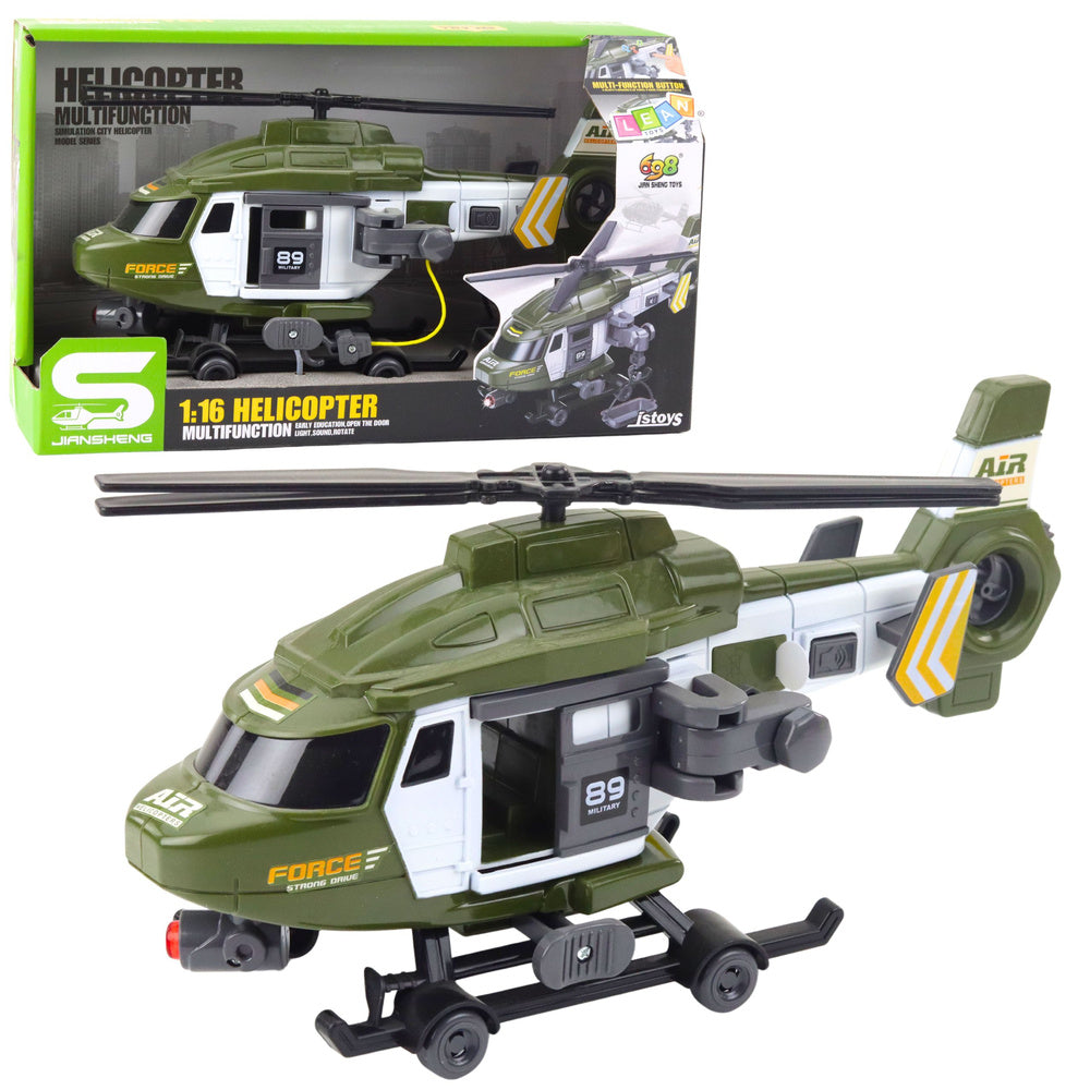 Vrtulník nabízí světelné a zvukové efekty aktivované tlačítky, které dokonale napodobují reálné letové zvuky a signály. Rotující vrtule přidávají na autenticitě a kolečka umožňují snadné manévrování po povrchu. Speciální hák s nosítky umožňuje zvedání a spouštění nákladu nebo zraněných osob, což otevírá prostor pro hraní záchranných misí a vojenských operací.