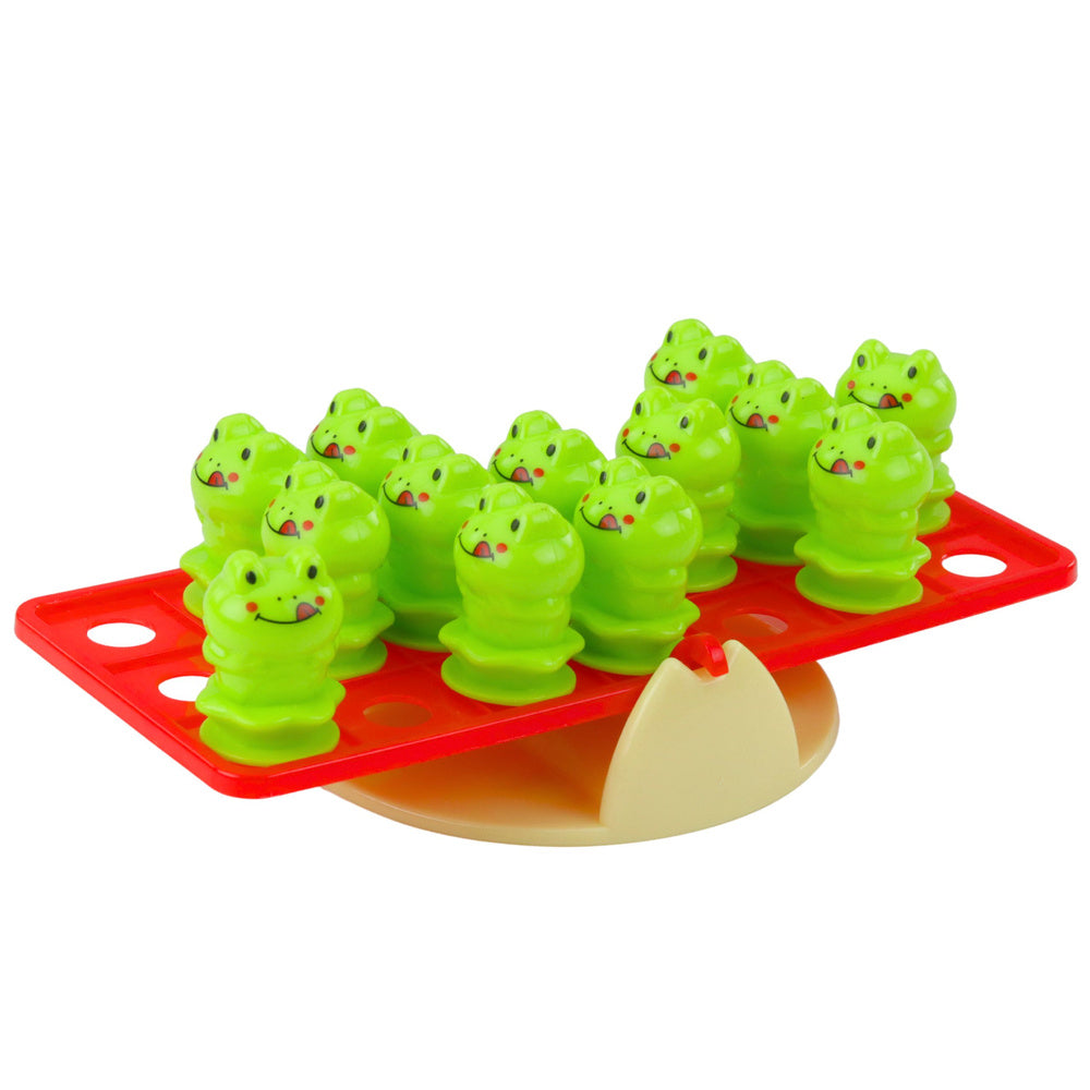 Vzdělávací hra s balancujícími žabkami je zábavná hračka, která rozvíjí logické myšlení a manuální zručnost dětí. Úkolem je rozmístit barevné figurky žabek na obě strany základny tak, aby celá konstrukce zůstala v rovnováze. Každý tah vyžaduje přemýšlení a pozorování, což učí děti plánovat a předvídat důsledky svých akcí.